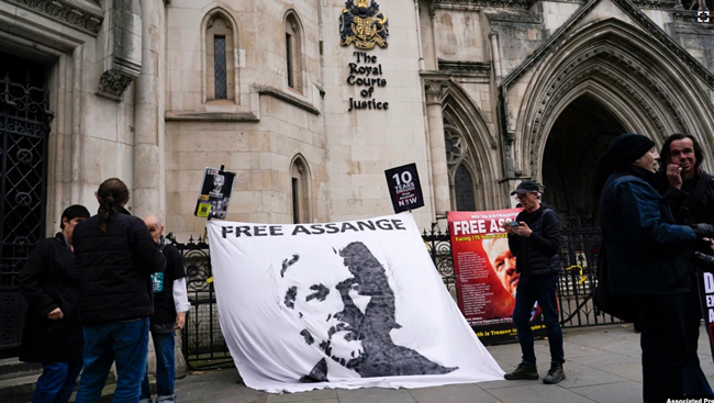 A banner in support of WikiLeaks founder Julian Assange is...